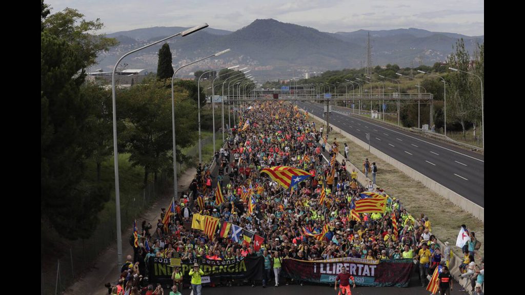 Με σύνθημα «Ελευθερία», δεκάδες χιλιάδες άνθρωποι, που είχαν ξεκινήσει από την Τετάρτη από πέντε πόλεις της περιφέρειας, συγκεντρώθηκαν στη Βαρκελώνη για αυτήν την ογκώδη διαδήλωση την Παρασκευή.